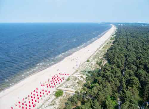 Luftaufnahme Promenade und Strand Abenteuerspielplatz auf der Promenade Konzertmuschel Sommer wie Winter ist es traumhaft schön Hauptstrandaufgang Haus des Gastes